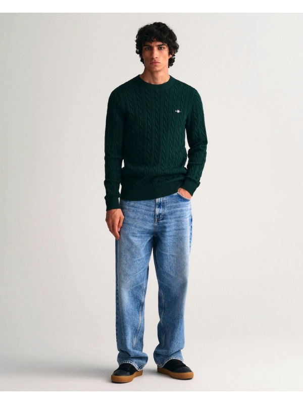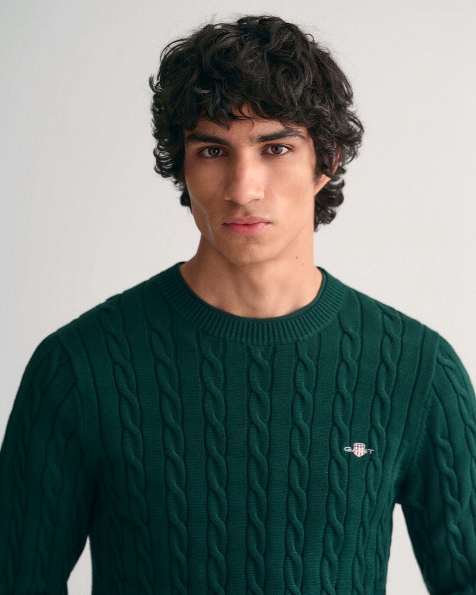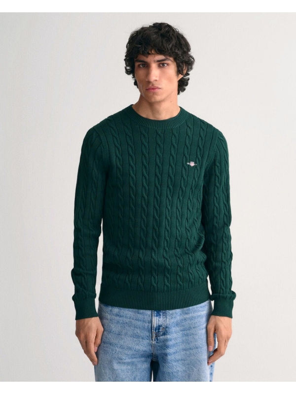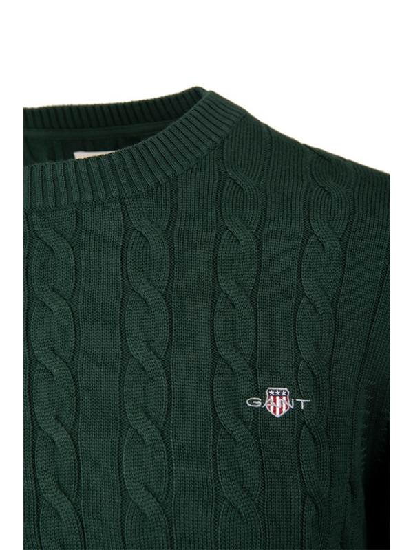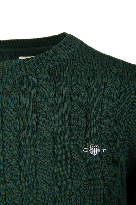 Πλεκτό πουλόβερ με λαιμόκοψη και ανάγλυφο, cable knit σχέδιο, από την δημιουργική ομάδα του οίκου Gant. Το ανάγλυφο cable knit σχέδιο, δίνει στο πουλόβερ μία πιο vinatge αισθητική. Το θρυλικό λογότυπο του οίκου Gant βρίσκεται κεντημένο στο στήθος. Από 100% βαμβακερό ύφασμα, σε κανονική γραμμή.