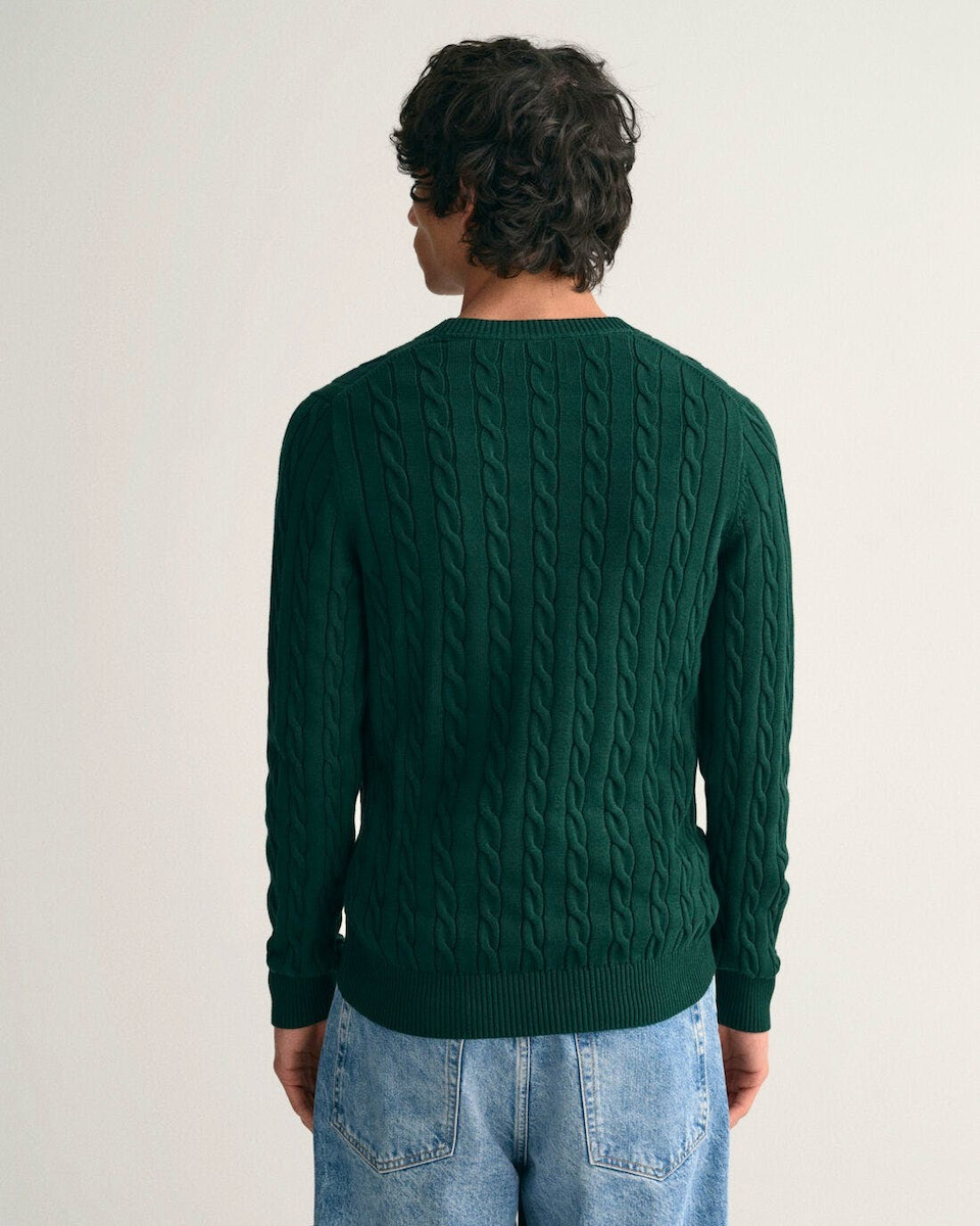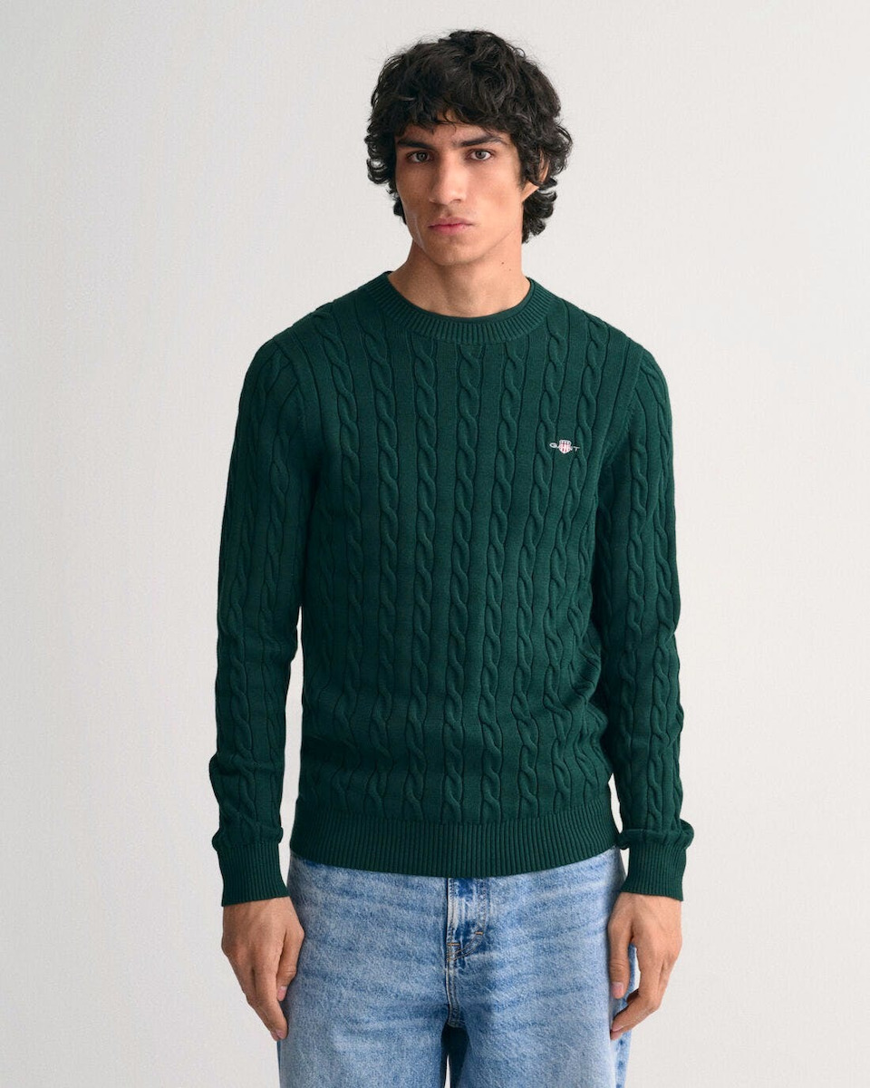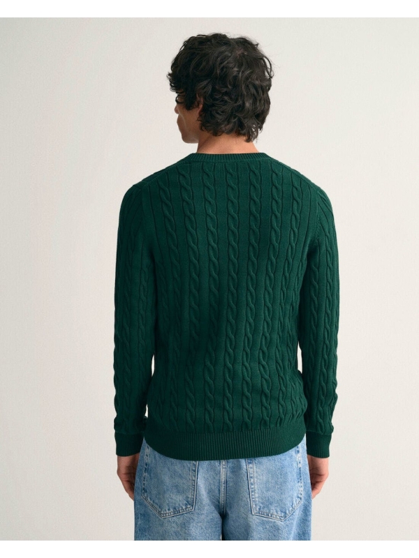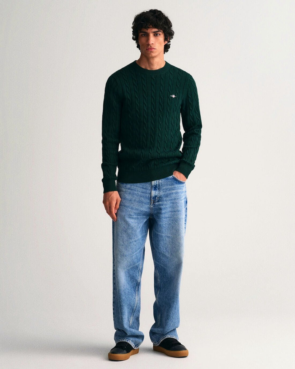 Πλεκτό πουλόβερ με λαιμόκοψη και ανάγλυφο, cable knit σχέδιο, από την δημιουργική ομάδα του οίκου Gant. Το ανάγλυφο cable knit σχέδιο, δίνει στο πουλόβερ μία πιο vinatge αισθητική. Το θρυλικό λογότυπο του οίκου Gant βρίσκεται κεντημένο στο στήθος. Από 100% βαμβακερό ύφασμα, σε κανονική γραμμή.